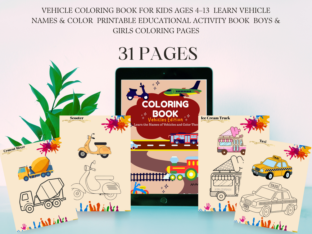 Vehicle Coloring Book for Kids Ages 4–13 | Vehicle Names and Color | Printable Activity Book for Boys and Girls