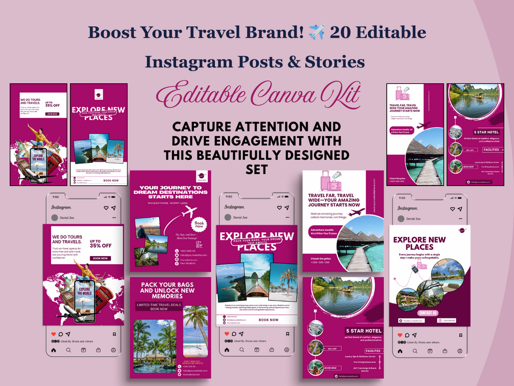 Travel Instagram Posts & Stories | 20 Editable Canva Templates | Wanderlust Social Media Pack | Digital Download