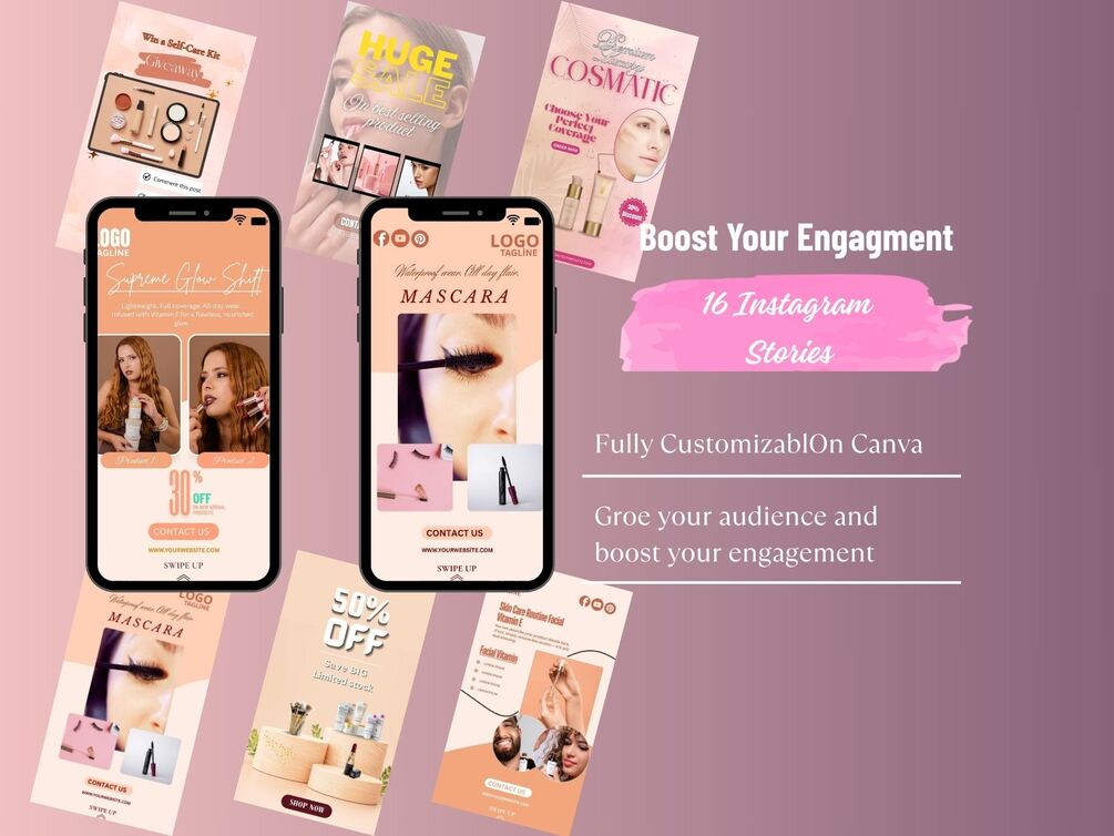 Upgrade your brand's social media presence with this beautifully designed set of 16 Instagram Story Templates — perfect for beauty, skincare, cosmetics, fashion, and lifestyle niches. These story designs are editable in Canva and ready to boost your engagement, product visibility, and promotional impact.
