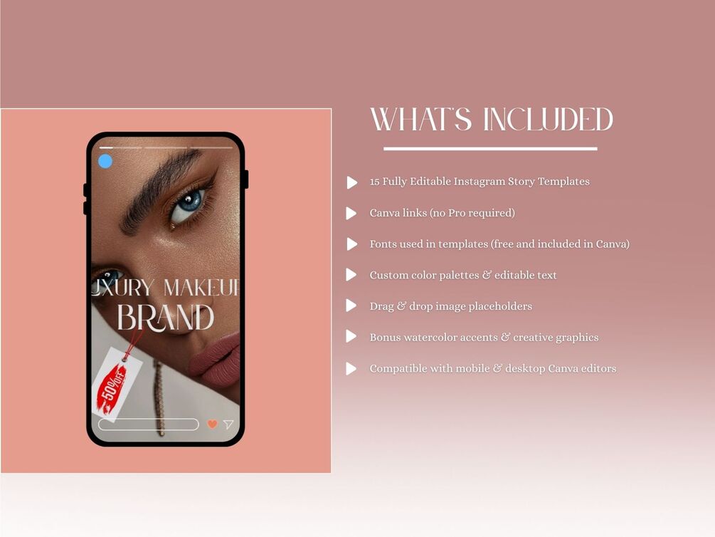 📱 16 Stylish Instagram Story Templates (1080x1920 px) 🎨 Fully editable in Canva — no Pro account needed 🖋️ Customize colors, text, fonts, images, and layout 📂 PDF with instant Canva access link 💼 Perfect for beauty, skincare, fashion, and lifestyle brands ⚡ Instant digital download — ready to use in minutes